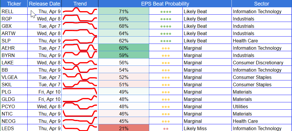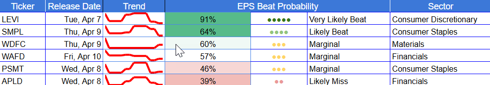 But the current week’s board is much narrower and much less clean than the quarter-level heatmap. The weekly file contains just 26 companies, no true mega-cap anchor, and only seven names above 60% beat probability. Said differently: the quarter looks broadly green, but week one is still a selective tape, not a universal green light.