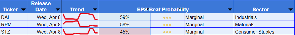 That is not enough to create a broad large-cap message. The takeaway is that large-cap reaction risk this week is idiosyncratic, not thematic. DAL and RPM lean modestly positive, but neither is a high-conviction outlier. STZ screens below 50%, which keeps Consumer Staples from offering a clean large-cap read-through.