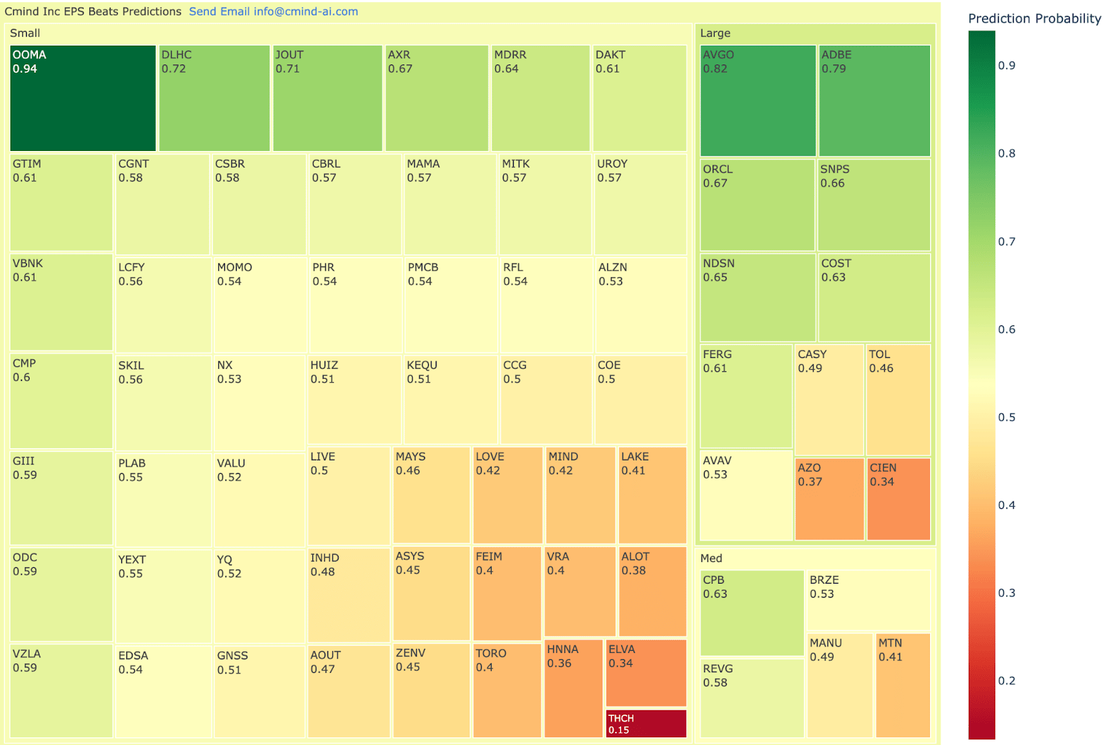 The left tail is equally clear. THCH posts a 15% beat probability, the weakest signal on the map, flagging it as a high-risk Discretionary print. Other notable laggards include CIEN (34%) in large-cap Tech, AZO (37%) in auto parts, and ELVA (34%) and HNNA (36%) among smaller Industrials and Financials. With most of the universe clustered near 50%, these extremes—AVGO/OOMA at one end and THCH/CIEN/AZO at the other—are where the model sees the cleanest opportunities for differentiated earnings alpha this week.