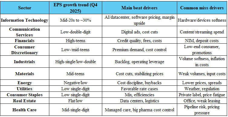 Tech/Comm/Utilities = heavier left-tail pockets. This is where your risk hedges live this week: more names screening ≤30% implies fragility flags where one line of guidance can dominate the quarter.