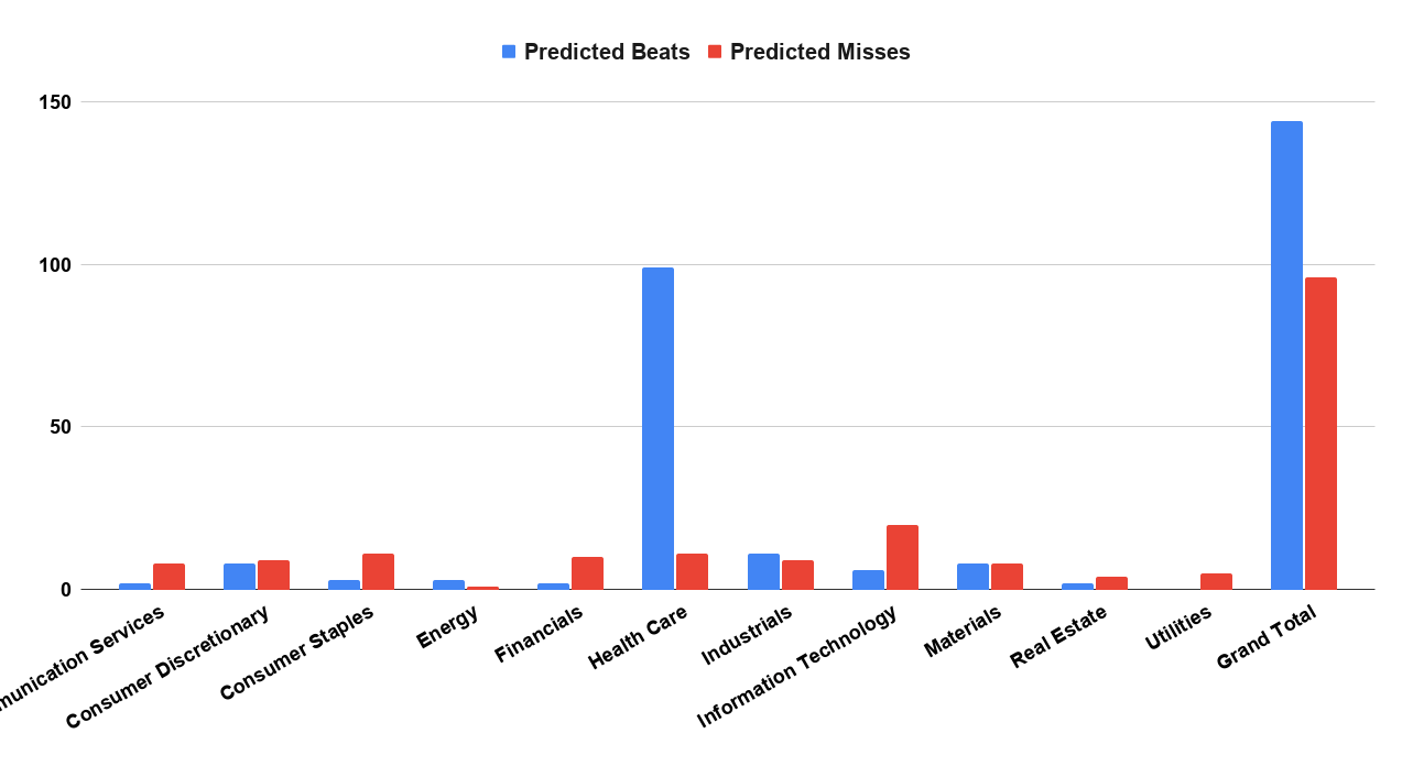 Health Care = broad neutral density. A lot of names, but mostly mid-band probabilities—less about “big beats,” more about dispersion inside the band (the tape will trade guide language + pipeline/coverage tone).