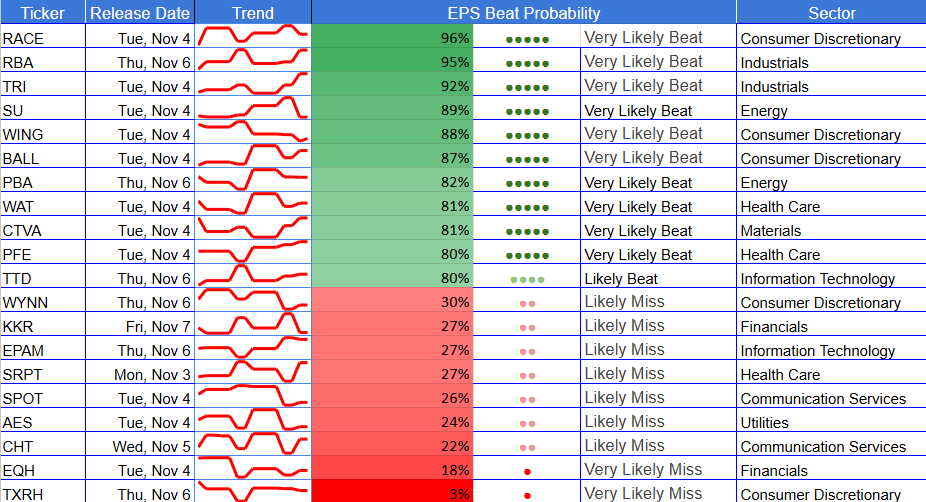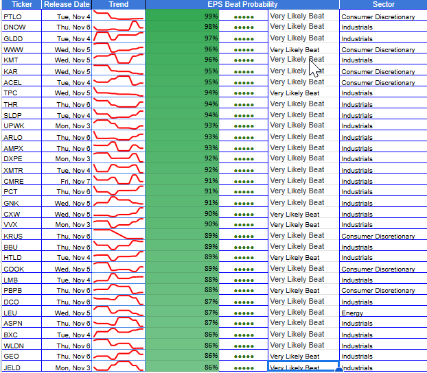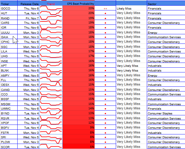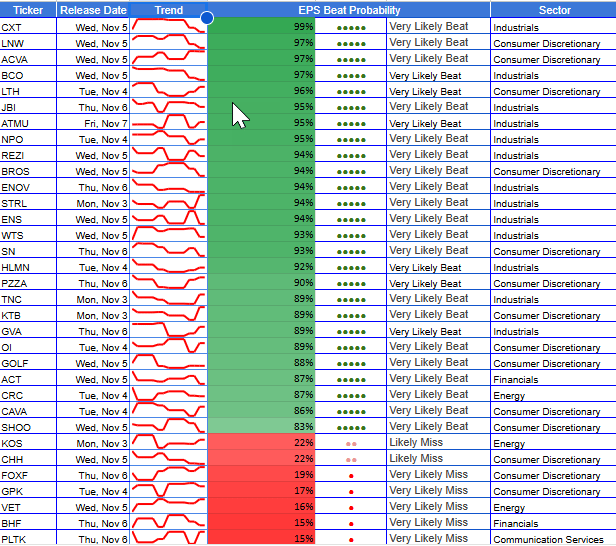 Small-caps remain the most “barbelled”: at the high end, asset-light operators and niche industrials such as GLDD 97% and WWW 96% screen as very likely beats—often driven by backlog visibility, pricing power, and tight SG&A control. Walk carefully where the broadest red cluster sits in micro-cap retail/media/long-tail tech. The low end tilts toward stressed consumer and micro-cap media/advertising: FSTR 8%, BGFV 9%, XPOF 12%, RSVR 13%, plus CCO 15% and OESX 15%. With liquidity thinner and pre-announcement risk higher, expect outsized post-print drift in both directions—i.e., a fertile setup for dispersion rather than directional small-cap beta.
