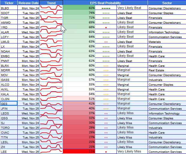 Thanksgiving week is lighter in count but rich in dispersion. The new heatmaps show contiguous green in execution-led Industrials and platform-heavy Tech/Comm Services. At the same time, oranges/reds gather in rate-sensitives, peripheral & PC-tilted tech, and promo-dependent consumer pockets. The right tail is anchored by Deere (DE, 96%) at the large-cap level, URBN (84%), WWD (72%), SMTC (70%) in mid caps, and a small-cap cluster led by BLBD (82%), SDOT (74%), TIGR (71%). On the left tail, notable miss-risk sits in LEE (13%), ZH (25%), CVAC (29%), TITN (27%), and, in mid/large caps, NIO (29%), FRO (39%).