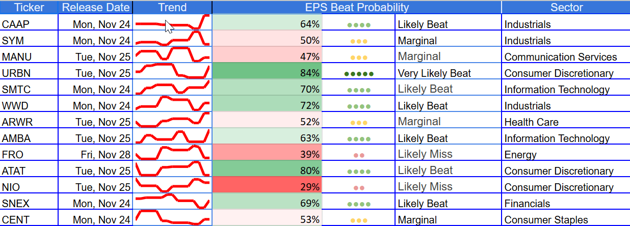 Into the holiday calendar and Q4 re-positioning, small-cap tails can travel fast—tax-loss harvesting and year-end window-dressing amplify both drift and reversals. Use the beats/misses tiles to stage a beta-neutral book: partner one or two green names with a hedge from the red block, then let confirmation drive adds or trims. Done right, this section can deliver the week’s highest information ratio with tightly controlled capital.