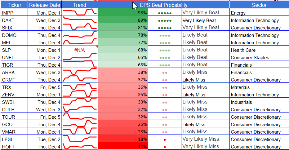 Small caps show the widest dispersion of the week, with a sharp divide between high-confidence beats and deep-red miss candidates. Names like IMPP (93%), DAKT (89%), and SFIX (81%) anchor the right tail, reflecting strong short-term momentum and clear operating leverage signals. The mid-pack cluster—UNFI (65%), TIGR (63%), and MEI (72%)—suggests stabilizing fundamentals but weaker visibility relative to the upper tier.
