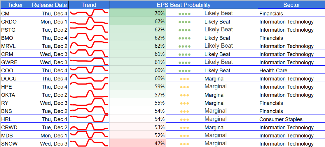 Large caps lean decisively toward the positive side of the distribution, with consistent “likely beat” signals across CM (70%), CRDO (67%), PSTG (62%), BMO (62%), and MRVL (62%). These names benefit from stable institutional demand, resilient margins, and cleaner operating models into year-end. However, dispersion increases within enterprise software: CRM (61%), GWRE (61%), COO (60%), and DOCU (60%) sit in the guidance-sensitive zone where beats may not translate into immediate upside.